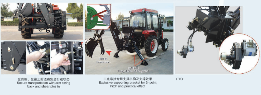 Several safety pins were designed and added on the backhoes, so as to guarantee the safety during transportation conditions. Driver can drive the tractor without any worries of sudden fall-down or swing of the backhoe.