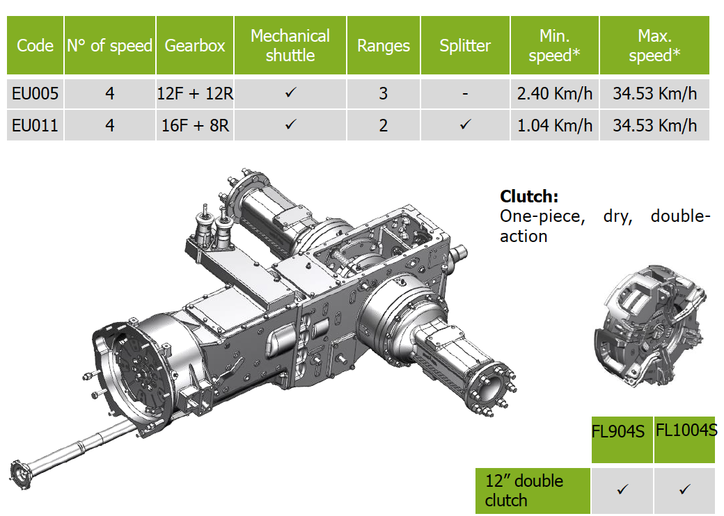 Ther FL1004S models feature a fully mechanical, durable and high efficient transmission. The gearbox features a 4-gears layout and is available in two variants: EU005: 16F+8R speeds, with 2 ranges and a mechanical splitter EU011: 12F+12R speeds with 3 ranges. Thanks to the synchronized gears, the shifting experience on the FL1004S is more comfortable than on competitor solutions with standard gearboxes not synchronized.