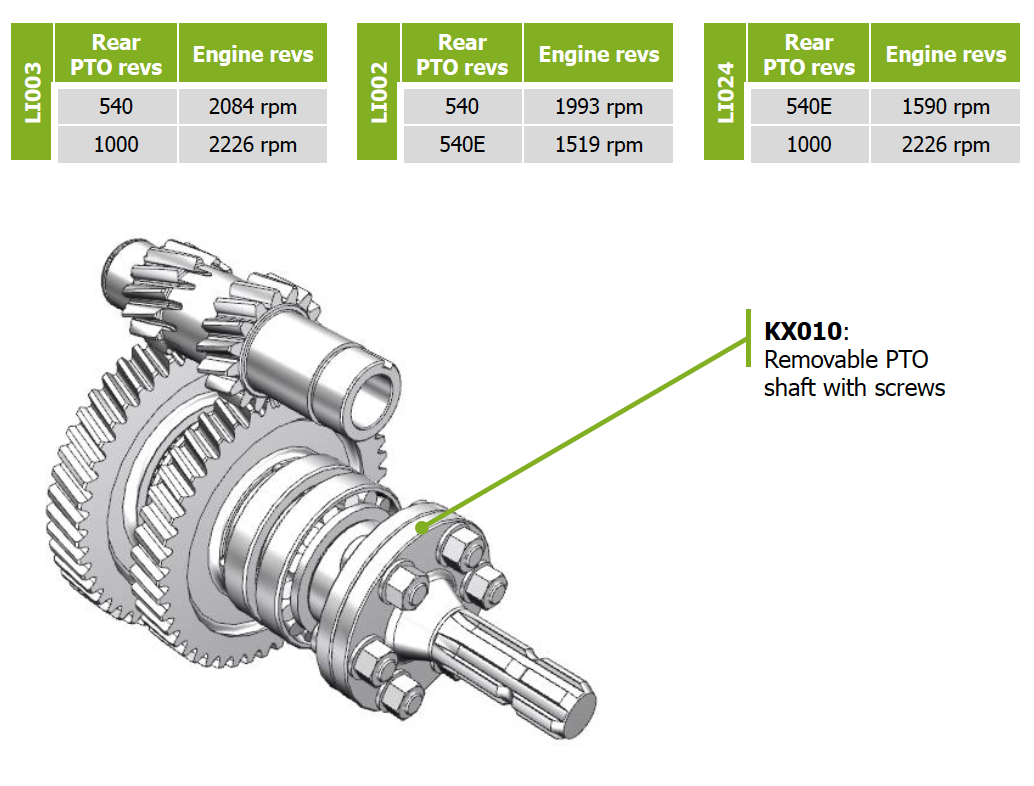 The PTO shaft of FL90S models has a diameter of 35mm and has 6 splines shape. Asstandard, PTO shaft is removable (KX010). Thanks to this solution, PTO shaft can be easily changed. Three configuration of PTO speed are available: