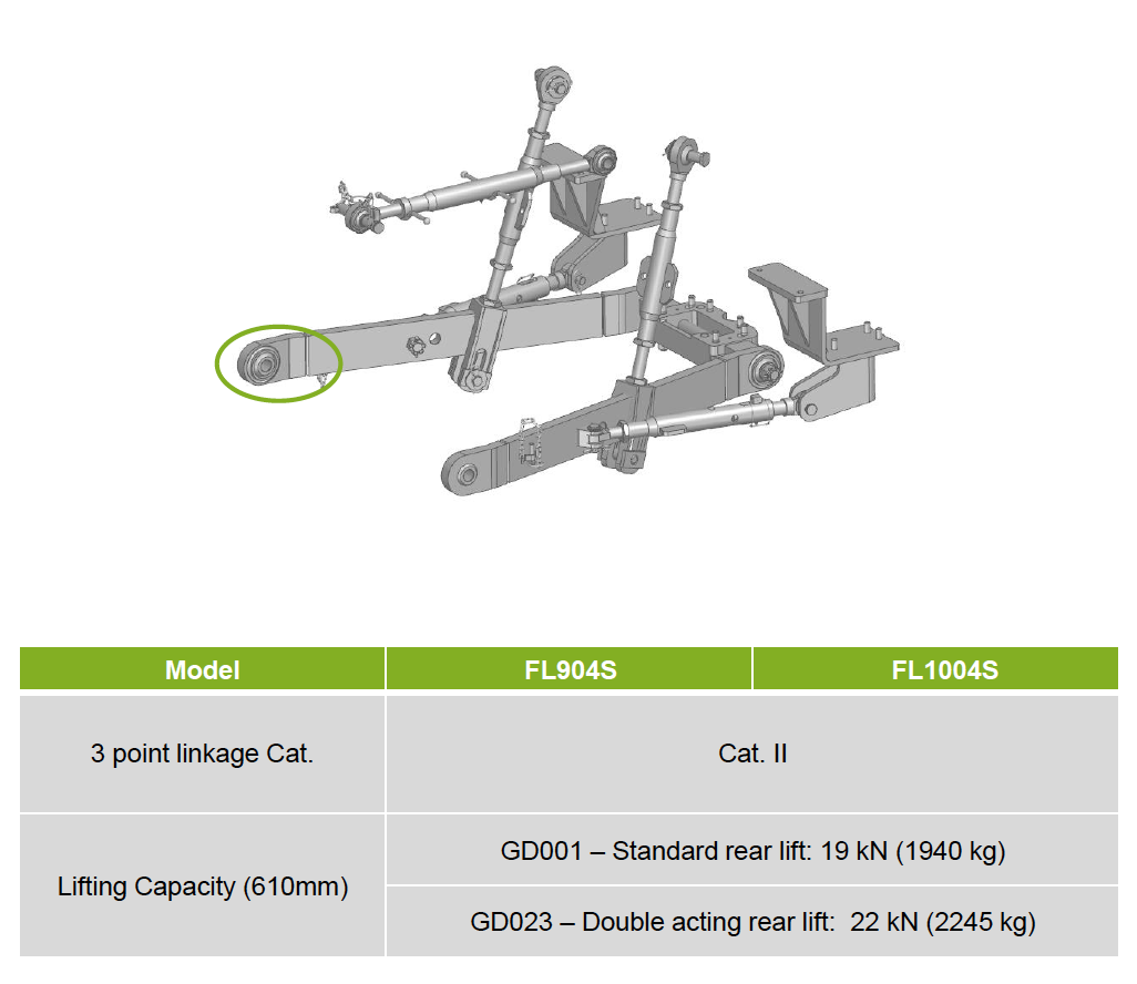 As standard all FL90S models feature a three-point linkage with telescopic stabilizers and mechanical tie rod. Upper and lower links have a fixed ends compliant with Cat. II standards.