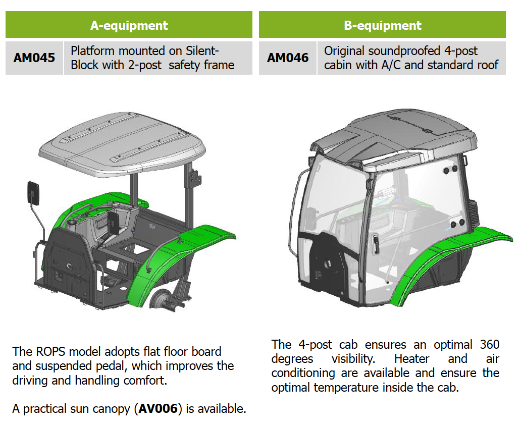 The cabin offers to the driver the right protection against dust and sun, and ensures an optimal 360 degrees visibility – thanks to its 4-post structure.