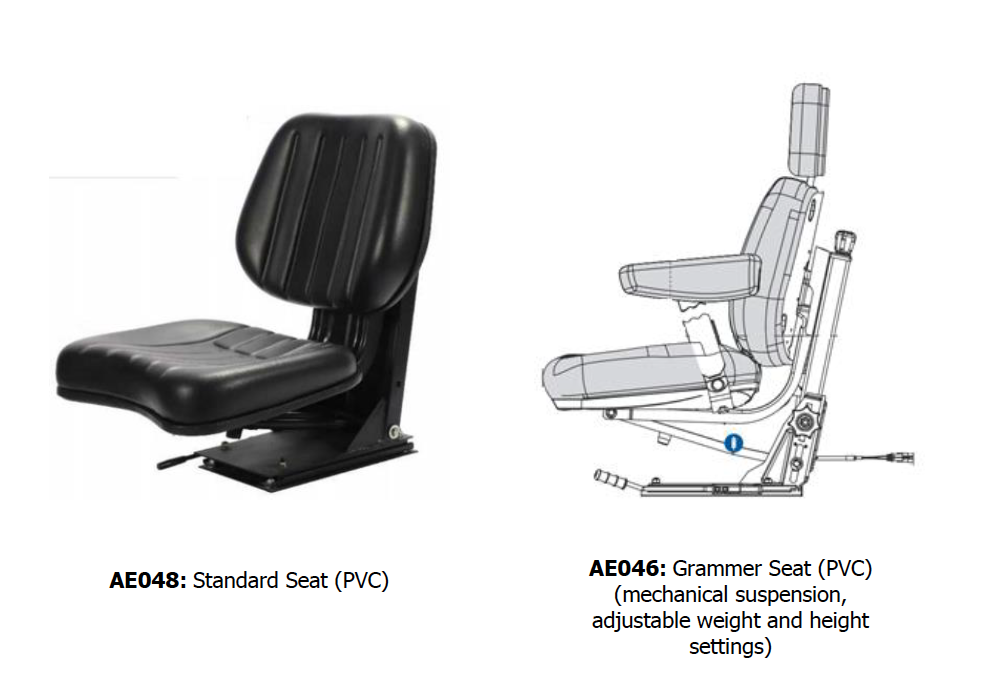 Two choices of driver seat are available. As standard a PVC seat with mechanical suspension and safety belt, while, as option, a Grammer mechanically suspended seat is available. By manipulating the front and rear adjustment handle of the seat, the driver can adjust the front and rear position of the seat according to the need.