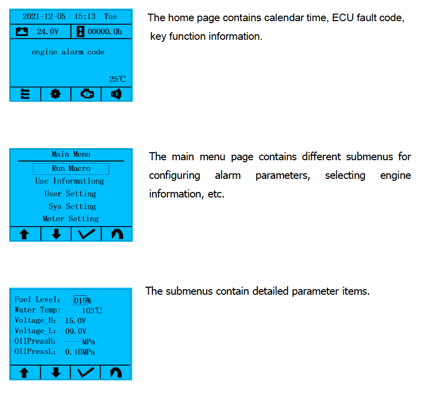 Driver can intuitively read the LEDs status of all indicators from the cluster. The four gauges accurately indicate the real-time values of engine speed, oil pressure, fuel level and coolant temperature.