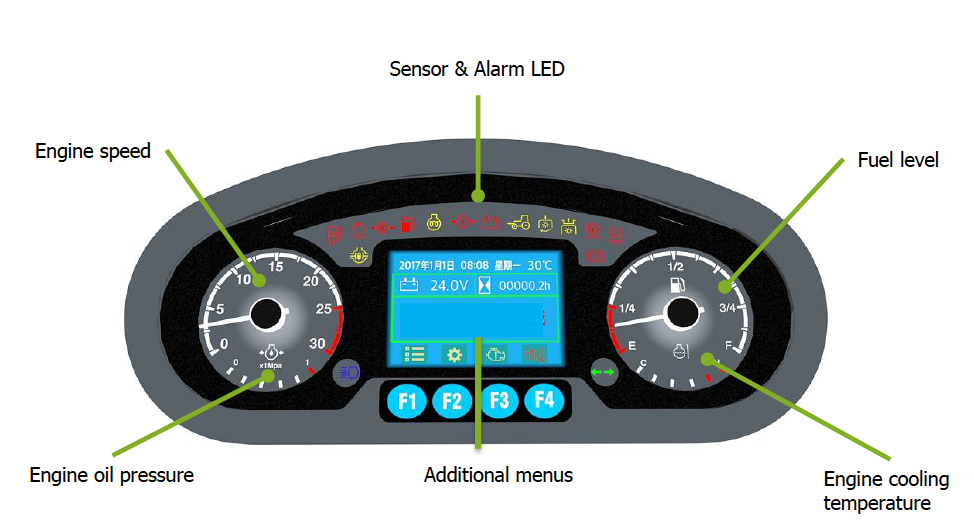 Driver can intuitively read the LEDs status of all indicators from the cluster. The four gauges accurately indicate the real-time values of engine speed, oil pressure, fuel level and coolant temperature.